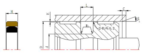 缸徑 D H9 | 溝槽底徑 d h9 | 槽寬 L +0.2 | H | R1≤ | C≥ |