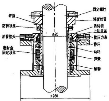 轉(zhuǎn)盤塔工藝條件:操作壓力0.6MPa,操作溫度150℃,主軸轉(zhuǎn)速0.5r/s,介質(zhì)為10%的糠醛溶劑和減二、三、四線混合物料,安裝位置在塔頂部(高27m)。主軸直徑80mm,長15m,直徑與長度之比為1∶190,屬超細長軸,剛性差,偏擺性大??紤]到塔內(nèi)物料含有10%的糠醛溶劑,糠醛溶劑遇空氣中的氧產(chǎn)生強氧化物,油變粘稠狀,而且具有腐蝕性。塔內(nèi)物料不能漏出來,而空氣也不允許進入塔內(nèi)。所以雙端面多彈簧、非平衡型密封形式作塔的軸封,如圖1