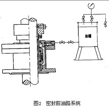 雙端面密封阻封液的注入方法,也經(jīng)過詳細的考慮和計算。密封腔裝在塔高27m的塔頂處,安裝1條阻封液管線,不僅工作量大,而且不經(jīng)濟??紤]到轉(zhuǎn)盤塔的轉(zhuǎn)速為0.5r/s,摩擦熱量和攪拌熱量均比較小,所以改用固定式氣壓注油法代替阻封液管線,見圖2。